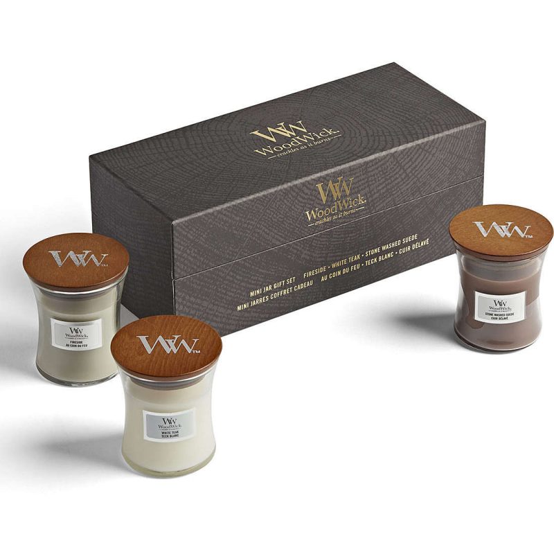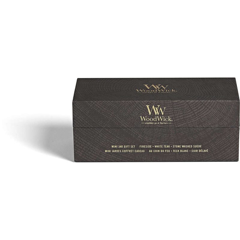 Prezioso scrigno con tre candele WoodWick formato Clessidra con fragranze eleganti e terrose.
