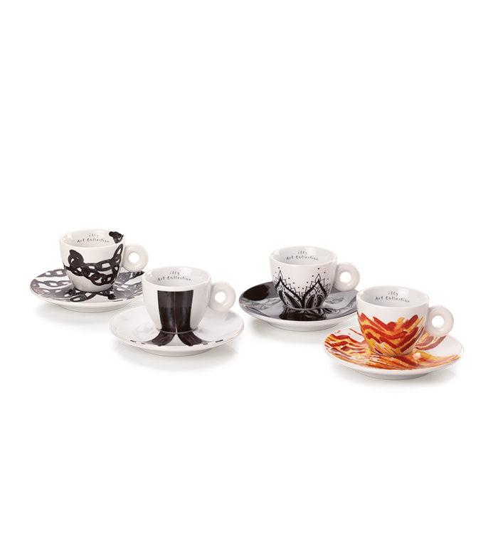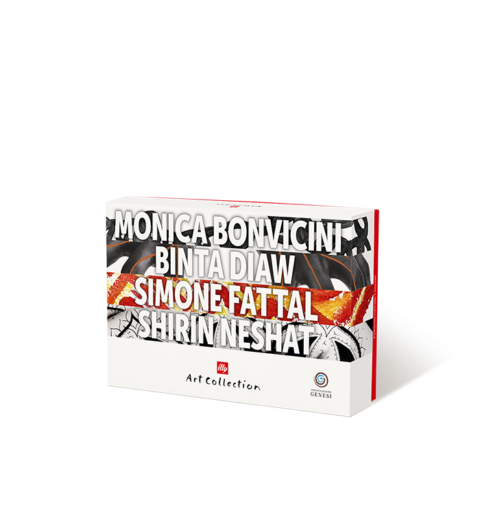 La confezione contiene quattro tazze da cappuccino con le opere di Monica Bonvincini, Binta Diaw, Simone Fattal e Shirin Neshat.