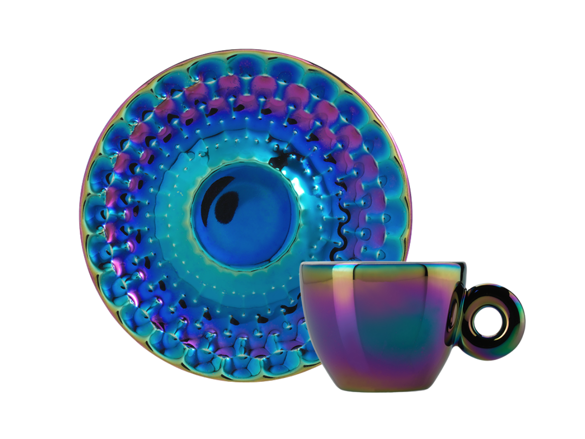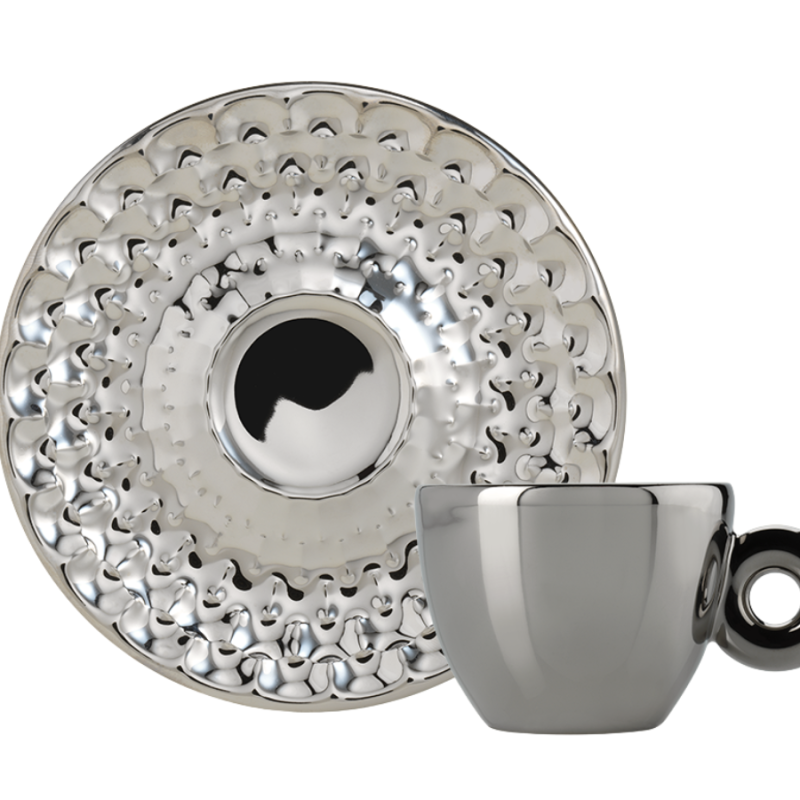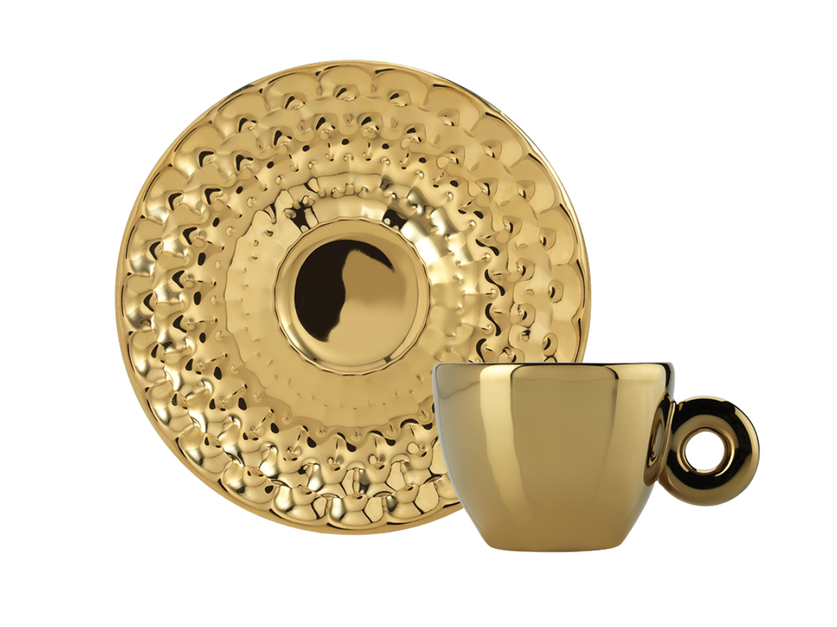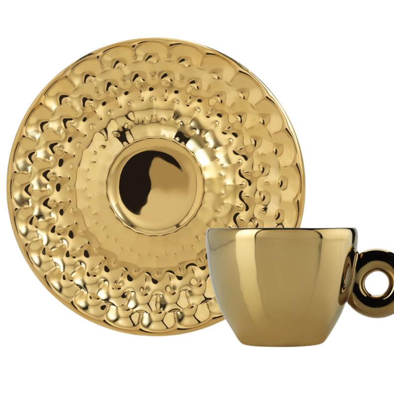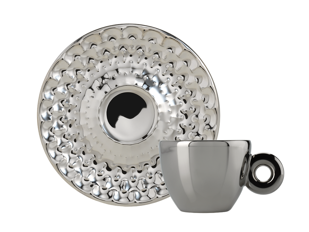 Ogni tazzina è realizzata in porcellana di alta qualità, decorata con dettagli metallizzati che evocano l’installazione artistica da cui nasce la collezione “Tastes”.