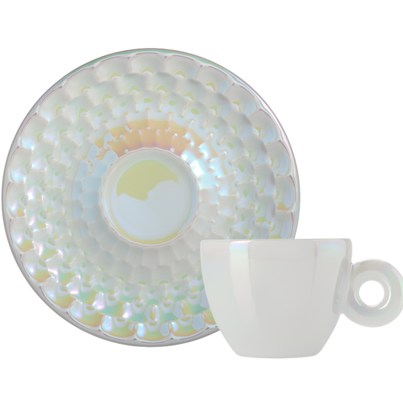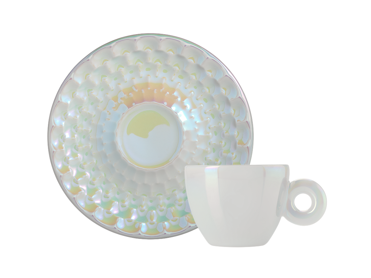 Ispirate all’effetto riflettente di una disco ball, le tazzine giocano con la luce e con lo spazio, creando riflessi sempre diversi — un richiamo visivo al movimento, al tempo e all’eleganza della forma pura.